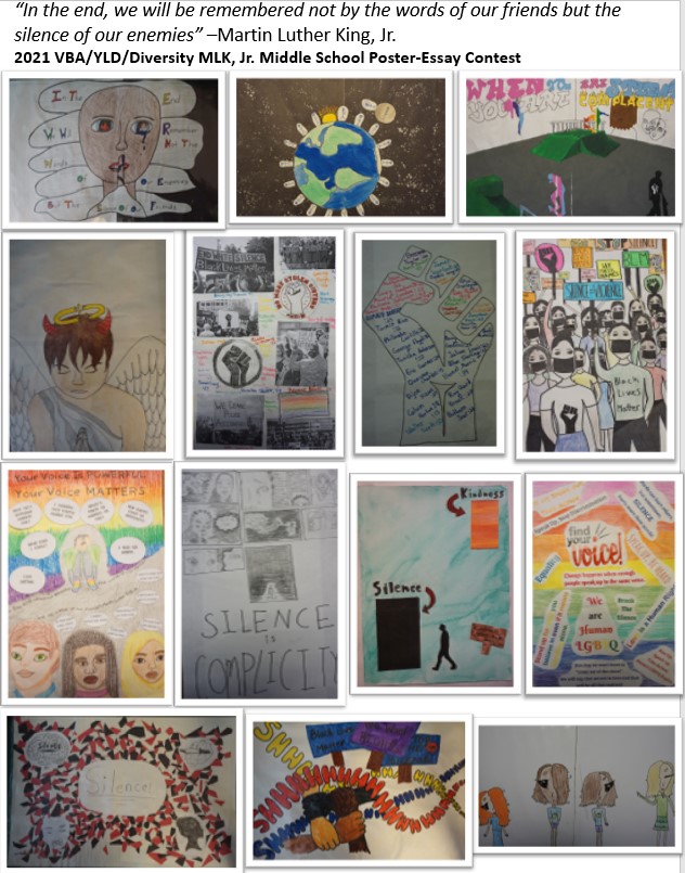 The VBA, along with its Diversity Section and Young Lawyers Division, hosted the fourth annual Dr. Martin Luther King, Jr. Middle School Poster-Essay Contest. Each year, a committee comprised of representatives from the VBA, the VBA Diversity Section and the VBA Young Lawyers Division, chooses a quote by the late Dr. King to inspire the students to participate in the contest. This year’s quote: “In the end, we will remember not the words of our enemies but the silence of our friends” served as inspiration to over 70 students who submitted a record number of entries!